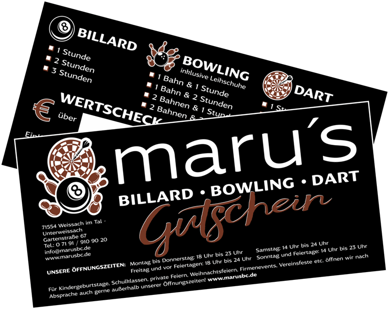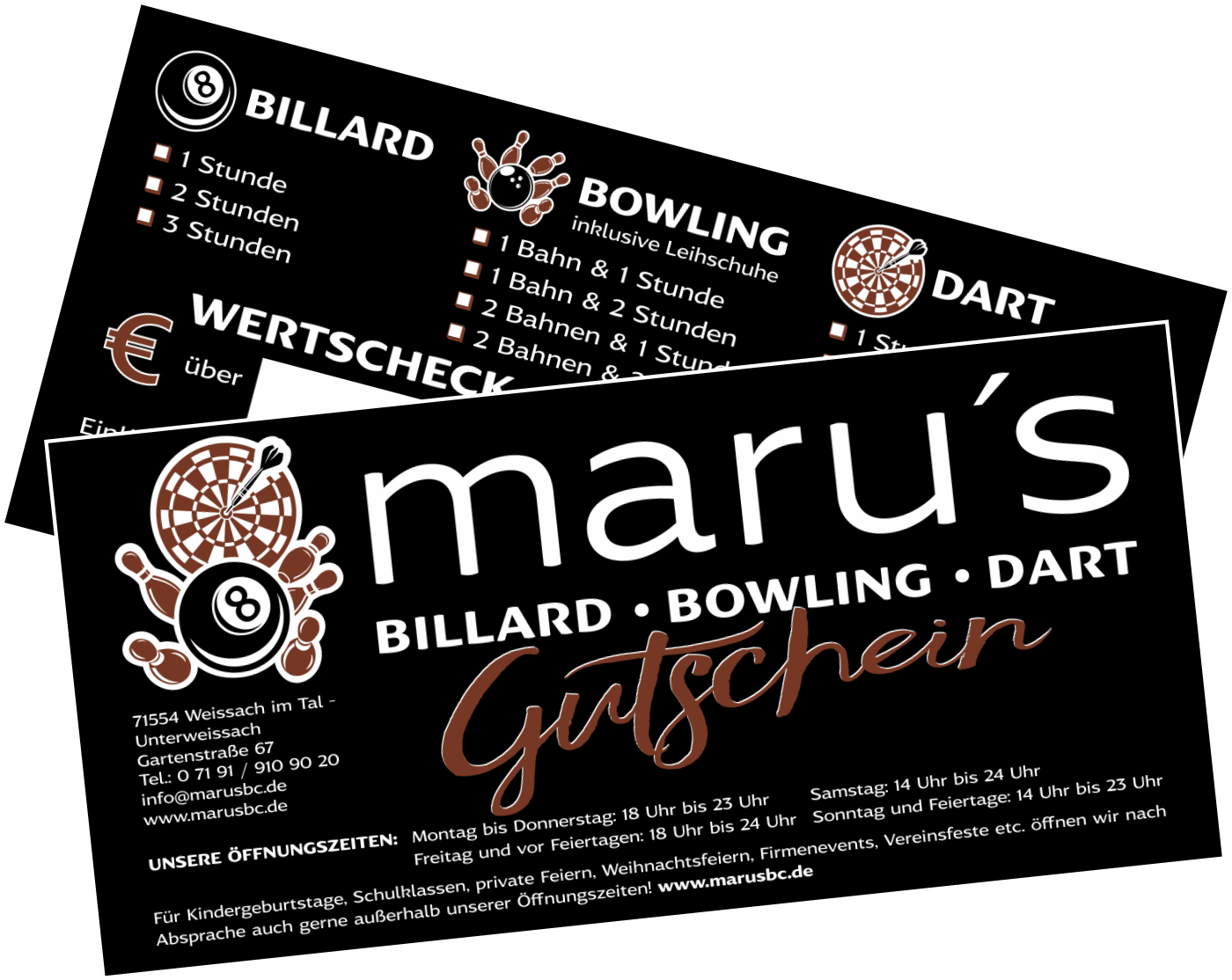 Das ideale Geschenk zu Weihnachten, zum Geburtstag oder einfach mal so: Schenkt eine tolle Zeit im maru's! Gutscheine erhaltet Ihr direkt im maru's!